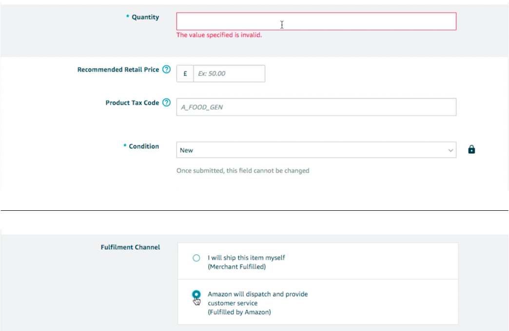 Then you can enter the price, the condition, and the quantity you have in stock. If you don't offer the shipping service and let Amazon organize all of this, go to "Fulfillment Channel" at the end of the page and select "Amazon will dispatch and provide customer service (Fulfilled by Amazon)".