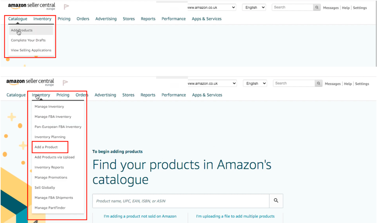 From Catalogue or Inventory select "Add Products"/"Add a Product". Both of these will take you to the same page.
