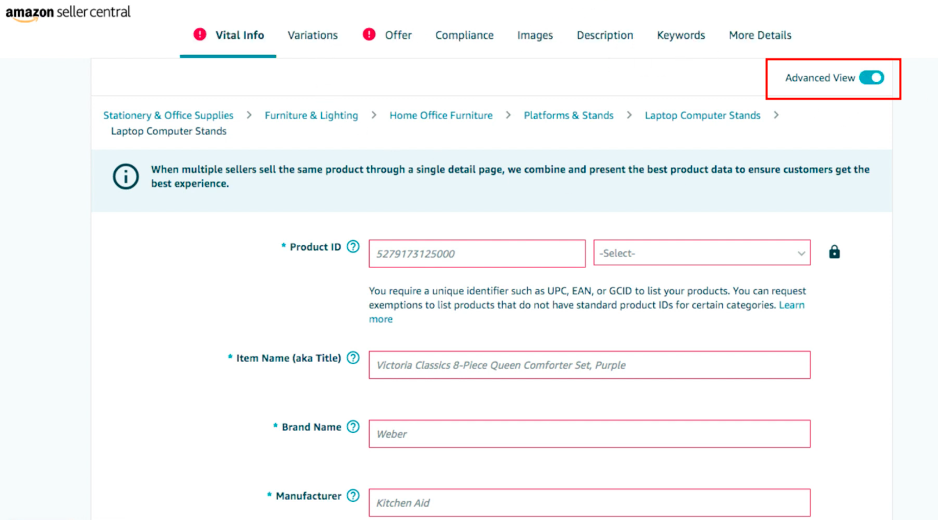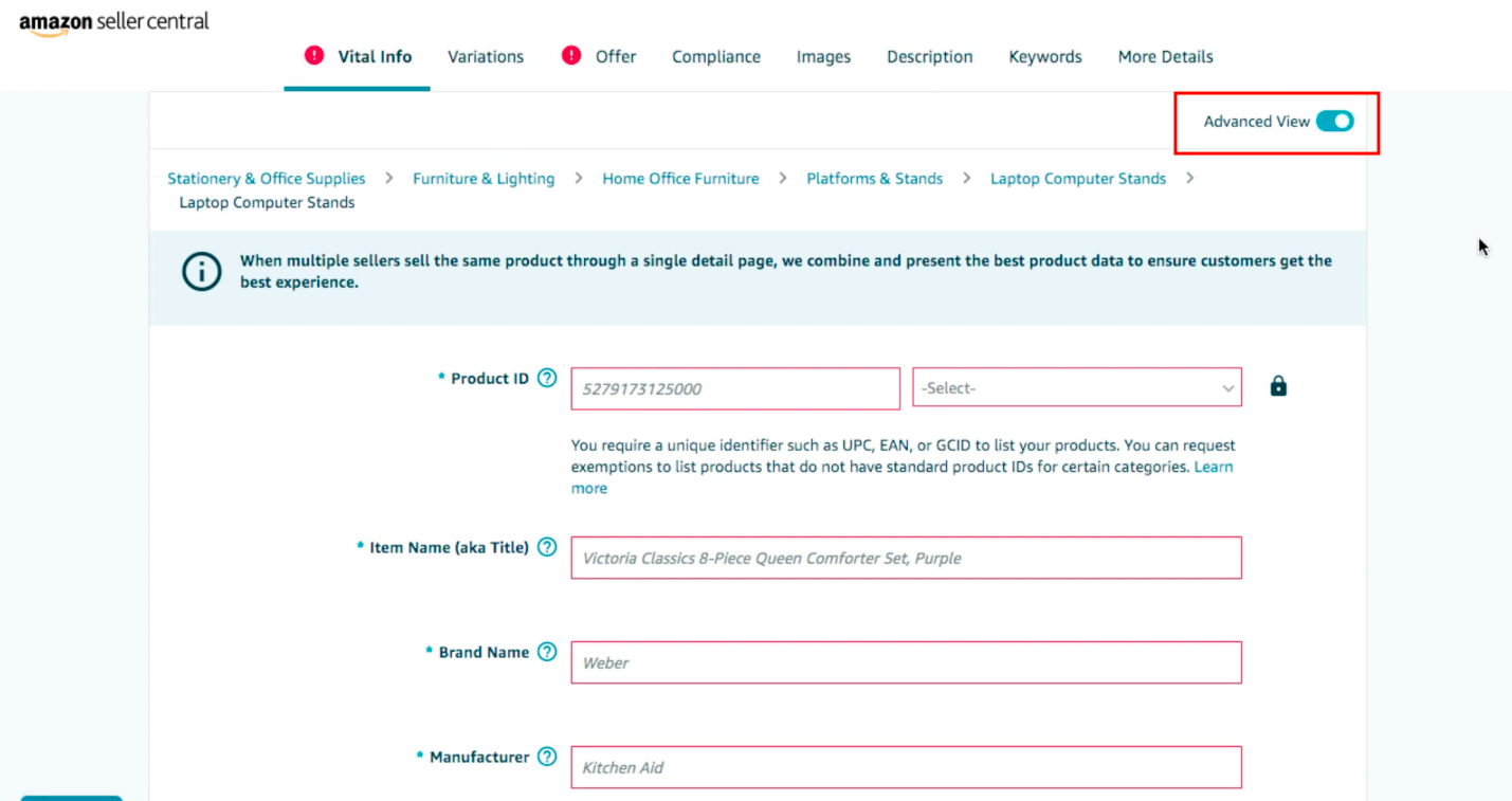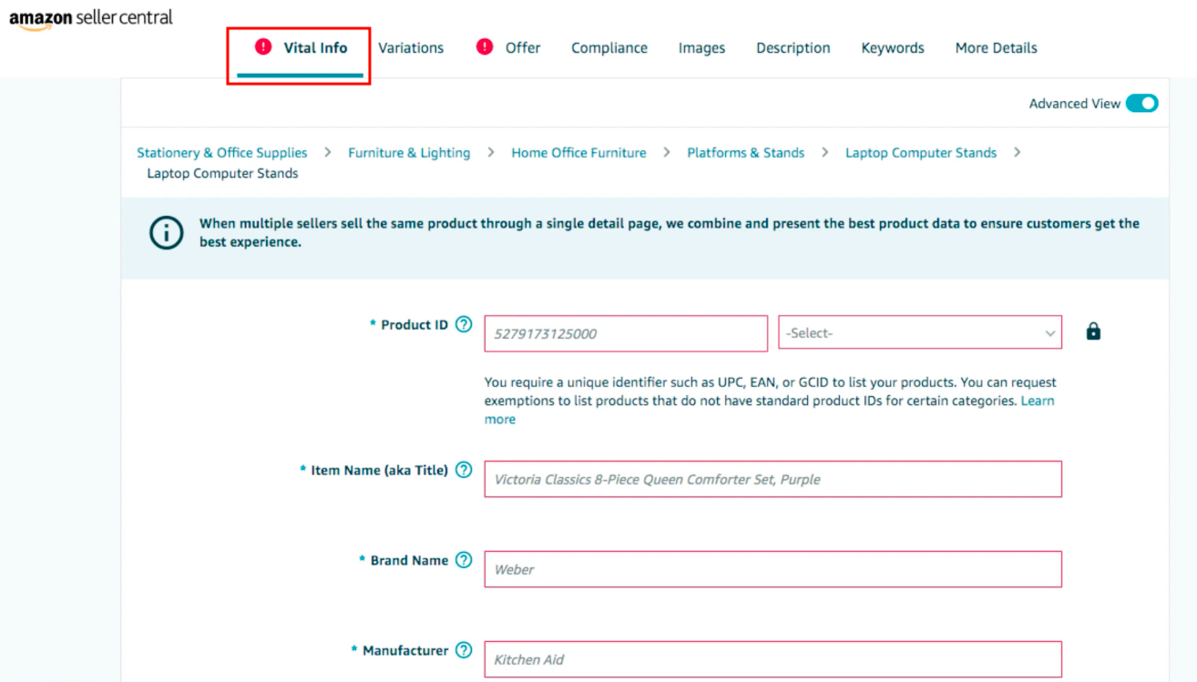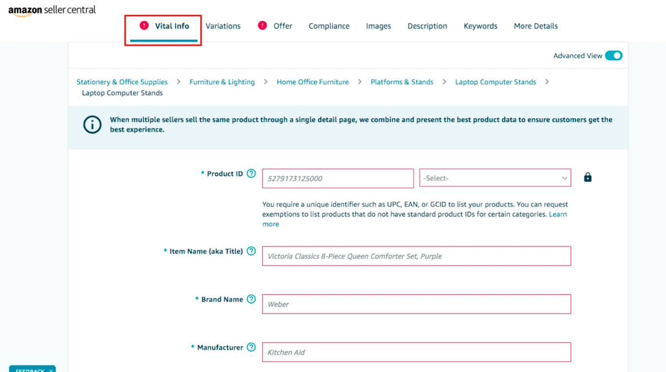 Now, you can go back to the "Vital info" and enter the Product Title, the Brand Name, and the Manufacturer.