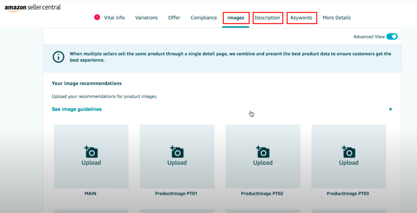 Now, you can add your images, bullet points, and description. You can also add those extra keywords not visible on your product listing but still relevant to your product.