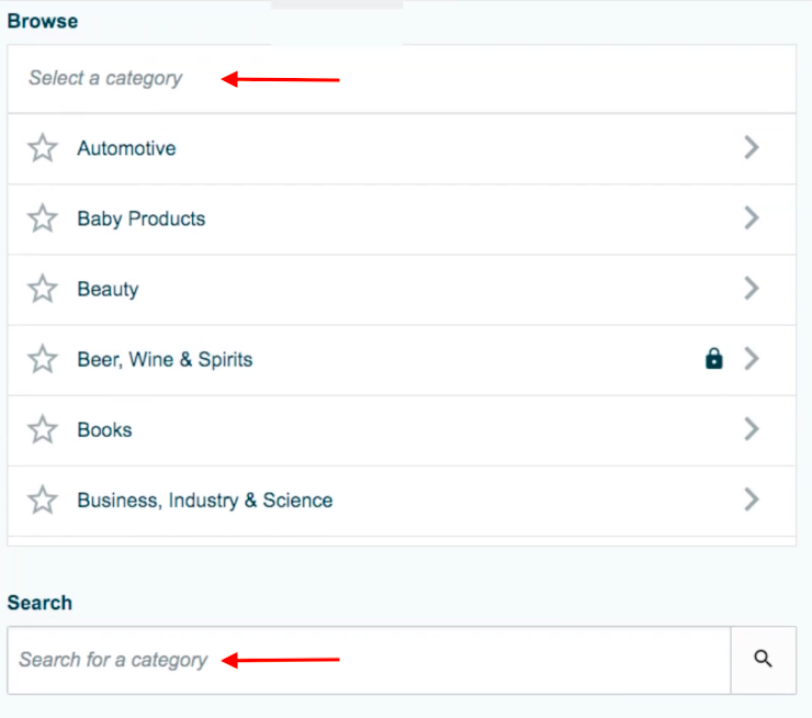 Your next step is to choose the category your product best fits into. If not present you can search it yourself in the "Search" tab available.